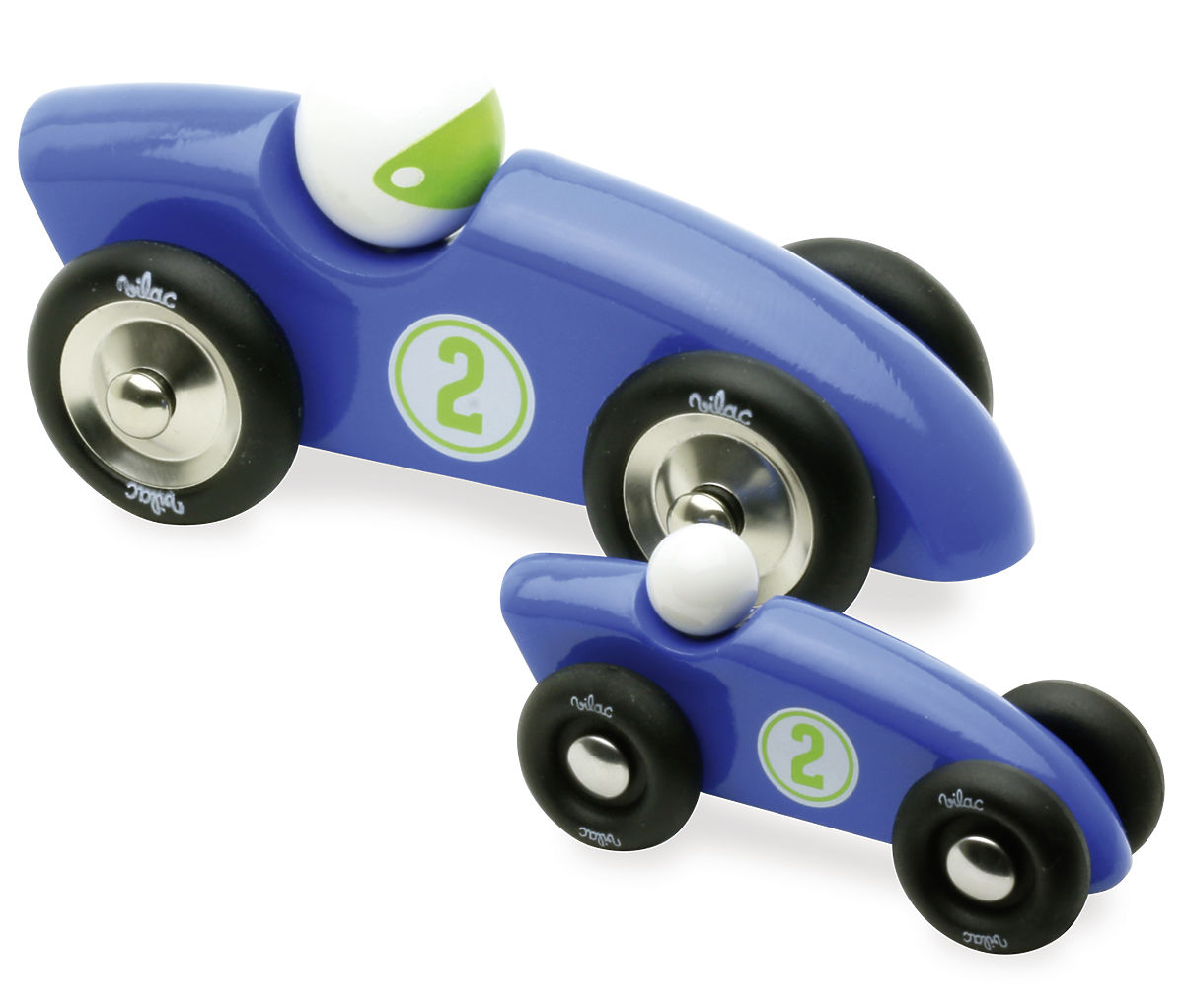 Auto da corsa blu dal design speciale, realizzato in legno laccato con ruote in metallo gommato. Adatto sia per giocare che come decorazione per le stanze di bambini o adulti. Prodotto in Francia. Principali caratteristiche: prodotto in Francia