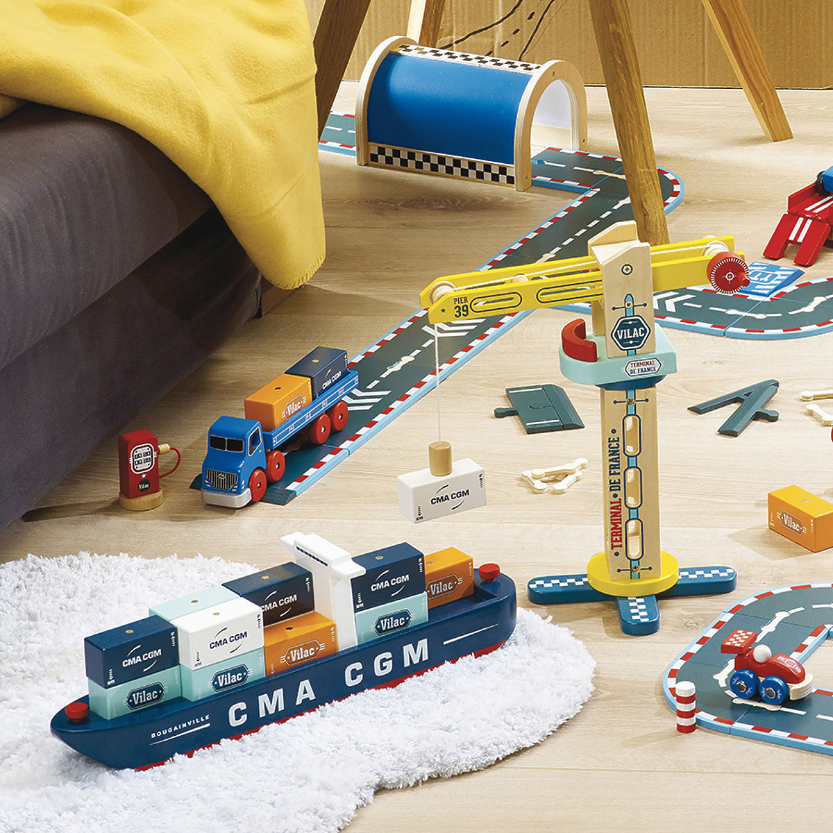 Camion di legno con rimorchio e container uniti magneticamente, realizzato in collaborazione con la principale società di trasporti francese CMA CGM. Fa parte della collezione Vilacity ed è completamente compatibile con tutti i suoi componenti; ulteriori estensioni separate offriranno variabilità e arricchiranno l'esperienza di gioco. Caratteristiche principali: camion, rimorchio e 4 container connessioni magnetiche compatibile con tutti i componenti della collezione Vilac Vilacity prodotto in modo ecologico, rispettoso dell'ambiente V2357 – Gru portuale Vilacity (non inclusa nel set, disponibile nella nostra offerta): V2356 – Nave da carico Vilacity (non inclusa nel set, disponibile nella nostra offerta): V2356S – Nave da carico Jacques Saadé Vilacity (non inclusa nel set, disponibile nella nostra offerta): Esempio di assemblaggio del camion con altri componenti della collezione Vilacity:
