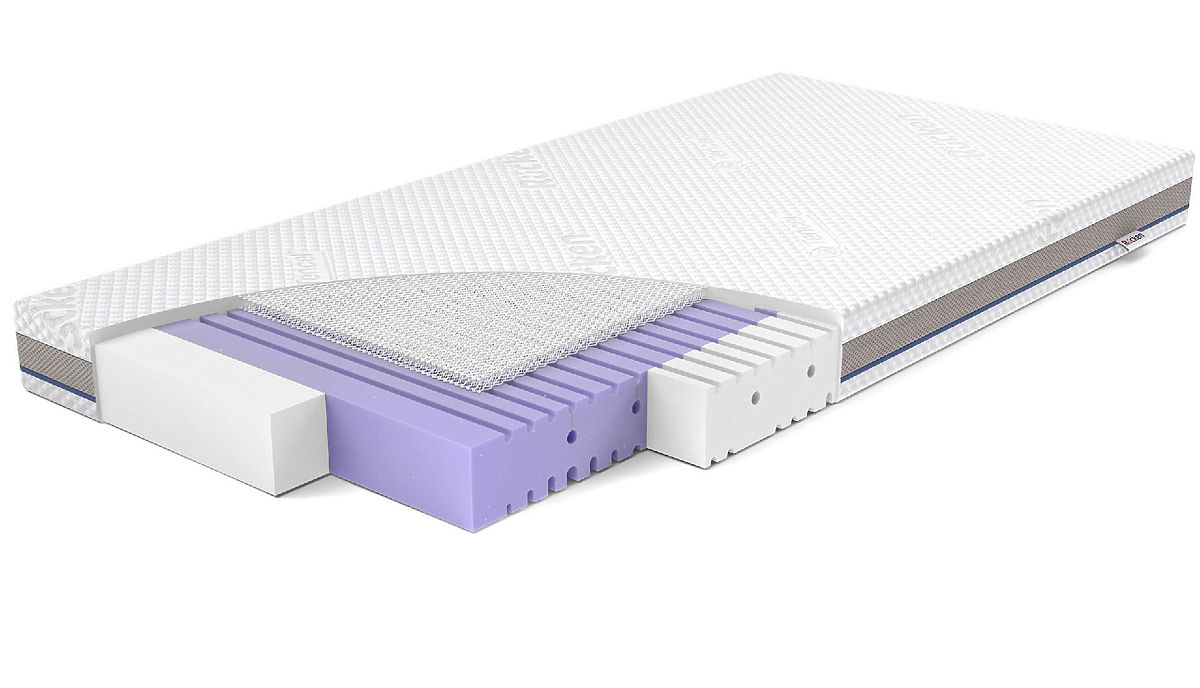 Schiuma ad alta elasticità VitaRest® HR 3532 – eccellente resistenza alle deformazioniPiù la schiuma è pesante, più è densa, più è resistente alla deformazione. Una schiuma comune nei materassi per bambini è la schiuma T 18 (18 kg/m3 - densità molto bassa e alto rischio di deformazioni). Nel materasso Aero utilizziamo la schiuma VitaRest® HR 35/32 (più schiuma nella schiuma). Garantisce un sonno libero da indesiderate ammaccature, che possono influire negativamente sulla colonna vertebrale in via di sviluppo del bambino. Inoltre, le schiume ad alta elasticità sono più resistenti alle deformazioni rispetto alle schiume PUR ordinarie anche dello stesso peso. Lo spessore dell'inserto del materasso è di 10 cm.