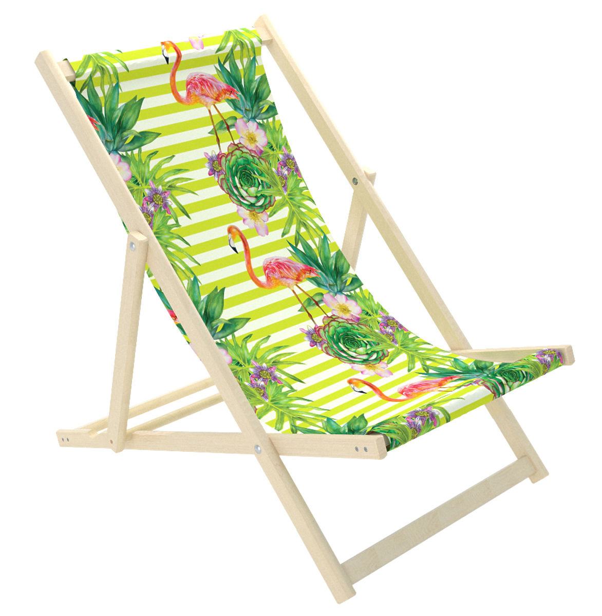 Bella sedia da spiaggia con motivo fenicottero e fiori tropicali. Il tessuto ha un bel colore verde con strisce bianche. Una sedia a sdraio per bambini è un'ottima alternativa a una sedia o una poltrona da giardino.