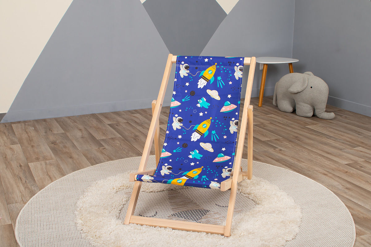 Un bellissimo lettino da spiaggia con un motivo di cosmonauti e stelle. Il tessuto ha un bellissimo colore blu scuro e irradia la profondità dell'universo. Un lettino da spiaggia per bambini è un'ottima alternativa ad una sedia o poltrona da giardino.