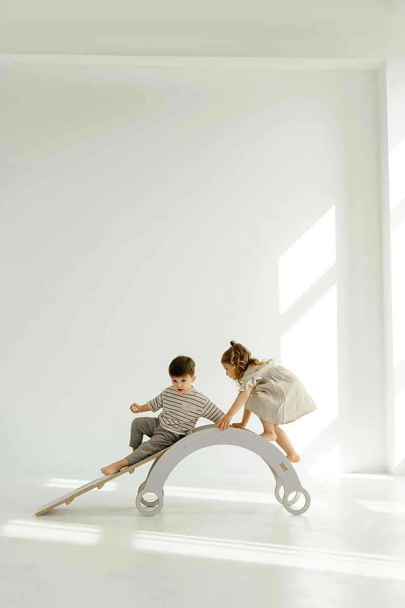 La stilosa altalena in legno Montessori con scivolo e parete da arrampicata in colore bianco si adatta perfettamente a qualsiasi sala giochi per bambini. Questa altalena non solo offre un divertente dondolio, ma anche la possibilità di arrampicarsi e scivolare, sviluppando così le abilità motorie, l'equilibrio e la forza dei bambini.