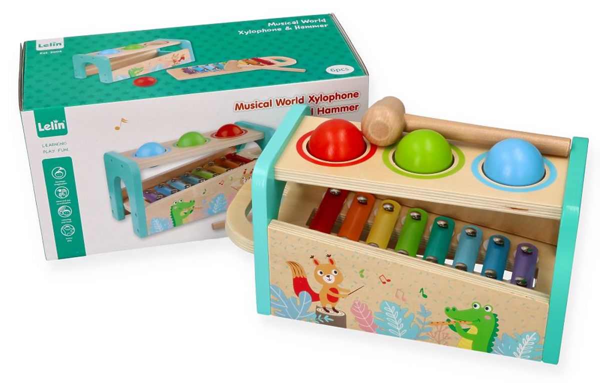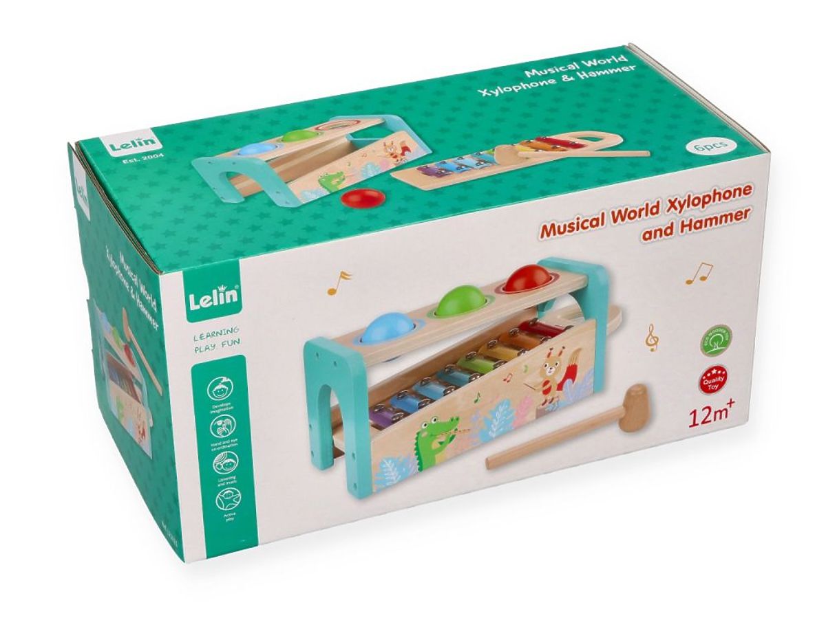 Il giocattolo è realizzato in legno e metallo. Il martello è in legno con un'estremità in gomma. Età: 12m+ Dimensioni: 28 x 13 x 14 cm Riferimento: L21021 Dichiarazione di conformità CE
