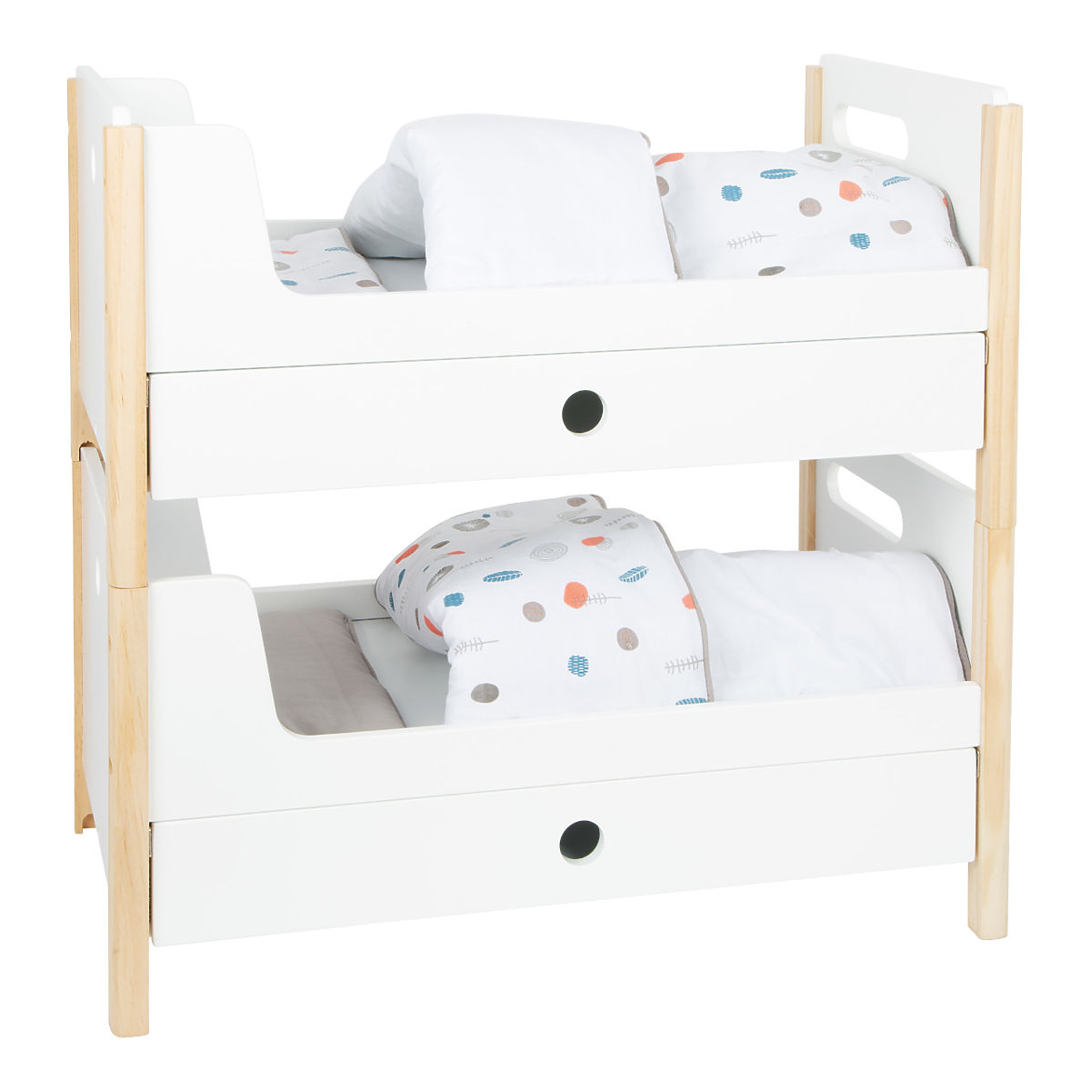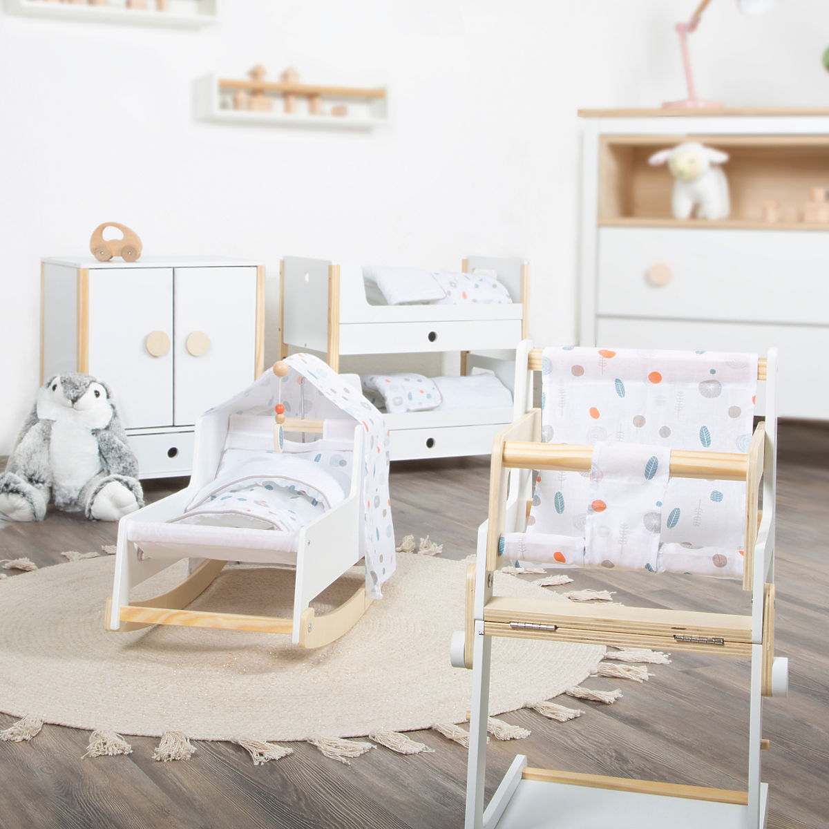 Una bellissima cuccetta! Ti conquisterà con la sua funzionalità e il design scandinavo, grazie al quale si adatta perfettamente a ogni cameretta. È moderna, reversibile, con biancheria da letto neutra rispetto al genere e piumoni oversize, in cui bambole e peluche fino a 46 cm possono dormire comodamente. Assemblando i letti a castello, si crea una scala su un lato. I cassetti sotto ciascun letto sono perfetti per riporre gli accessori delle bambole. Struttura di alta qualità, stabile, con bordi arrotondati, visibilmente in legno... Un giocattolo perfetto per ogni cameretta. Caratteristiche principali: Può essere utilizzato come letti singoli o a castello Cassetti per riporre accessori delle bambole Biancheria da letto neutra rispetto al genere Piumoni oversize Bordi arrotondati, visibilmente in legno Per bambole e peluche fino a 46 cm Design lineare scandinavo Little Button La gamma di accessori attraenti per bambole Little Button offre una vasta gamma di prodotti, dal passeggino al seggiolone fino all'armadio. Attirano facilmente i clienti con un design funzionale e sobrio che utilizza linee rette e colori neutri discreti. In questo modo, possono creare set armoniosi e completi che completano con gusto un interno moderno. La costruzione ingegnosa e la lavorazione di qualità aiutano a garantire alta stabilità, sicurezza e lunga durata. Con il loro aiuto, crea un angolo elegante per le bambole, dove i tuoi bambini possono sviluppare la loro fantasia e abilità di cura.