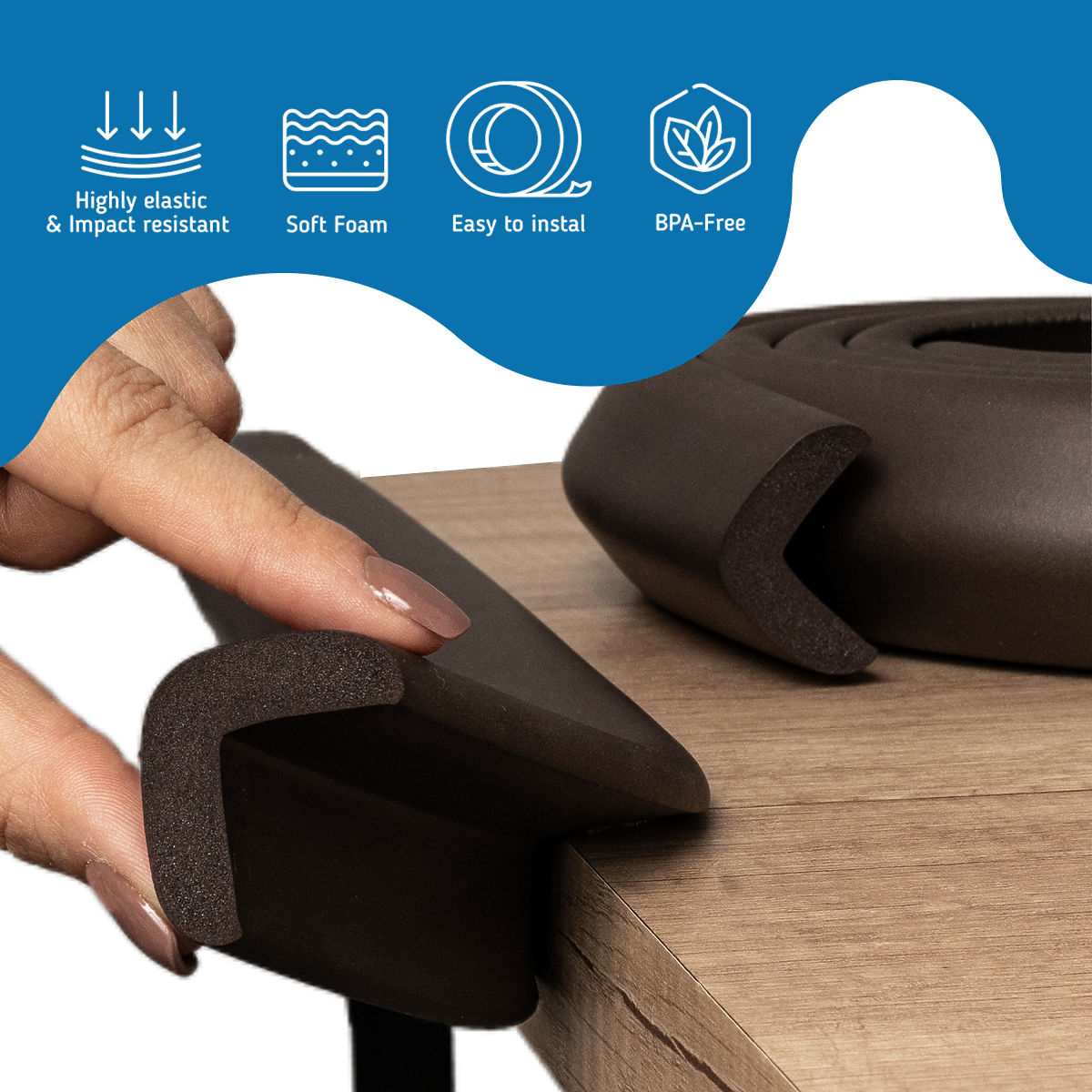Il nastro in schiuma marrone serve per gli angoli e altri spigoli vivi che possono causare lesioni. La protezione degli spigoli vivi e degli angoli è molto utile soprattutto per i bambini piccoli che stanno imparando a camminare e correre per casa.