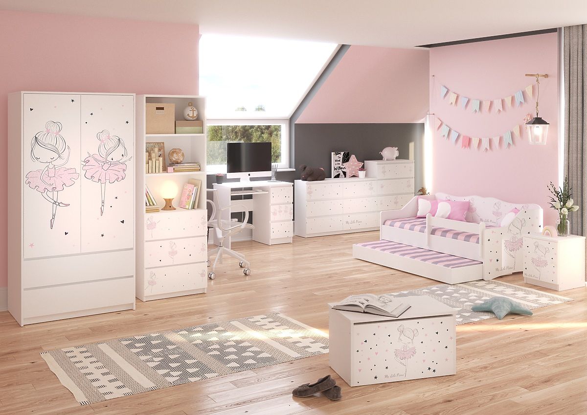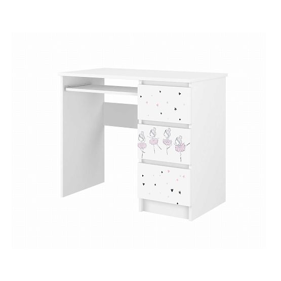 Scrivania per bambini con motivo ballerine in design bianco. Il tavolo comprende tre cassetti e un ripiano. Ideale per bambini in età scolare e in età prescolare. Realizzato in MDF di qualità con uno spessore di 18 mm.