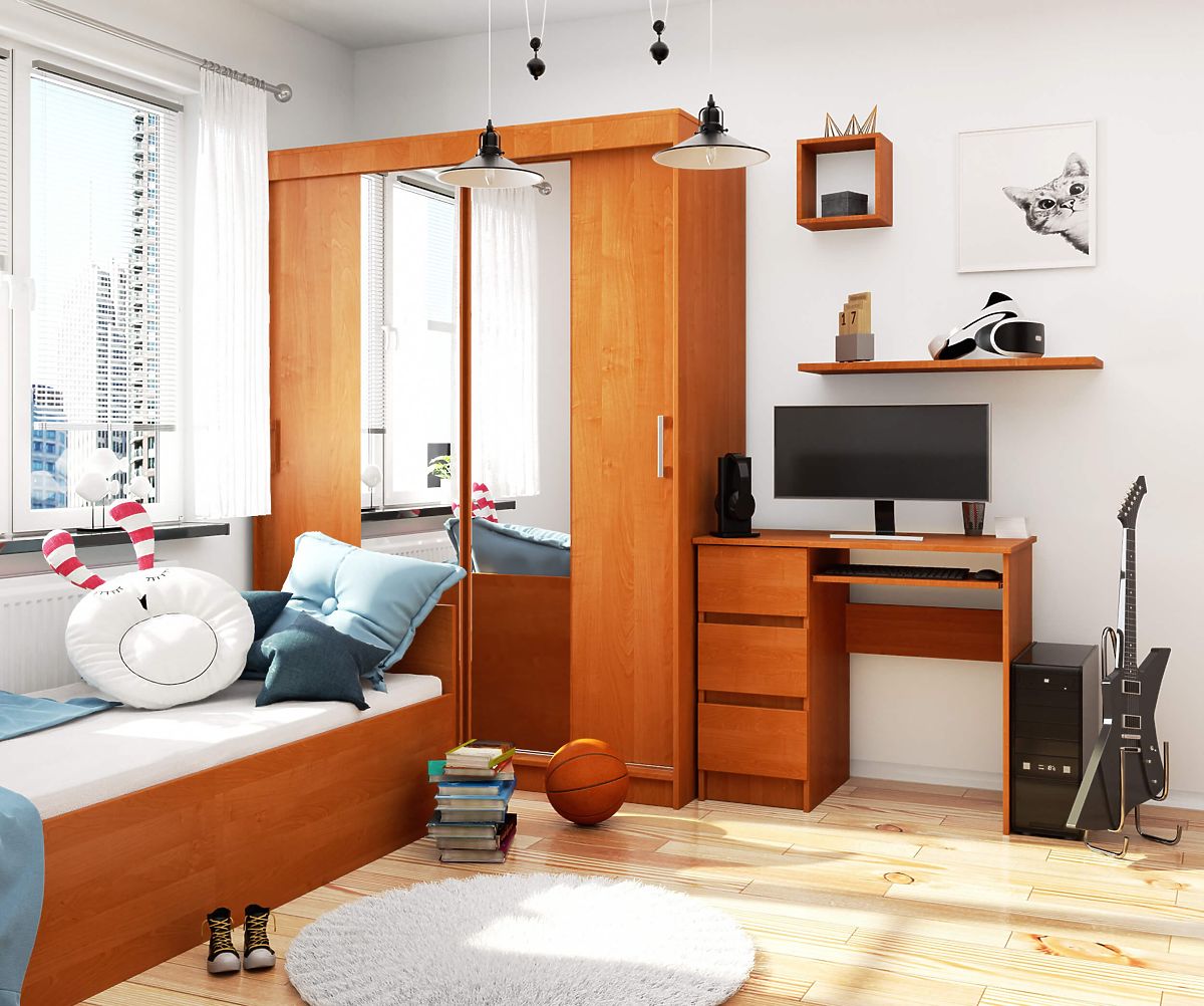 La scrivania presentata è realizzata in legno di ontano di alta qualità e pannello laminato resistente all'abrasione. È destinata al montaggio autonomo, il manuale allegato spiega in modo semplice e dettagliato come assemblarla. La scrivania è estremamente comoda da usare e garantisce comfort durante il lavoro o lo studio. Offre molto spazio per organizzare, ovvero tre cassetti e un ripiano estraibile su cui è possibile posizionare la tastiera del computer - si muovono grazie a guide a rulli in metallo, garantendo un movimento leggero e fluido. I frontali dei cassetti sono realizzati in pannello laminato. I bordi visibili sono dotati di bordo ABS, che garantisce un'elevata resistenza ai danni.