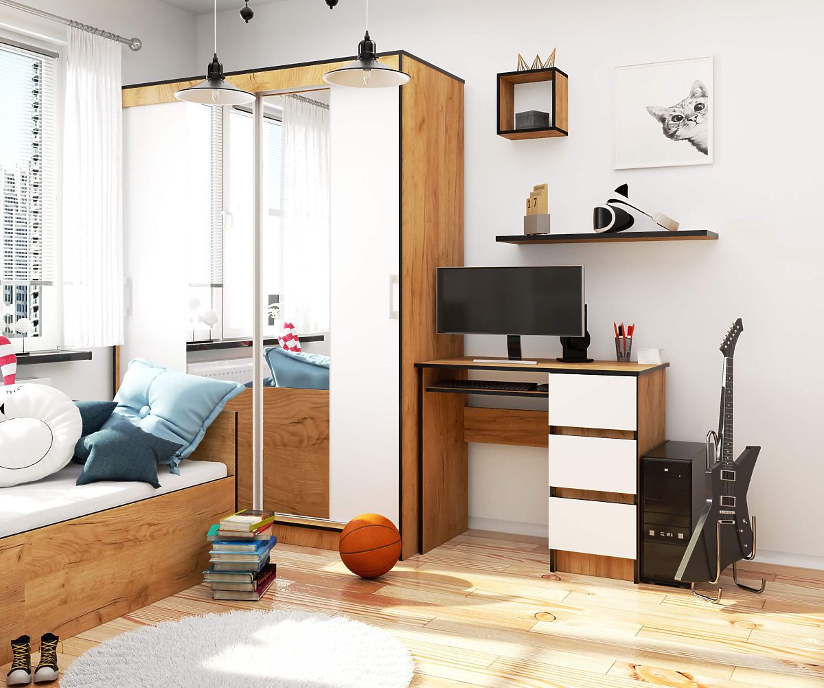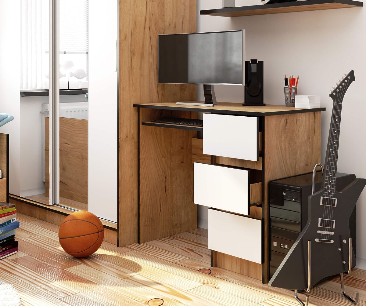 La scrivania A-6 di 90 cm in tonalità rovere craft con frontali bianchi si adatta perfettamente sia agli interni classici che moderni delle camere per bambini o ragazzi grazie al suo aspetto universale e senza tempo. Può essere utilizzata con successo anche come parte dell'arredamento di un ufficio domestico. Tutto dipende dalle esigenze e preferenze individuali dell'utente. Grazie a tre pratici cassetti, otterrete ulteriore spazio di archiviazione per vari oggetti che desiderate avere a portata di mano.