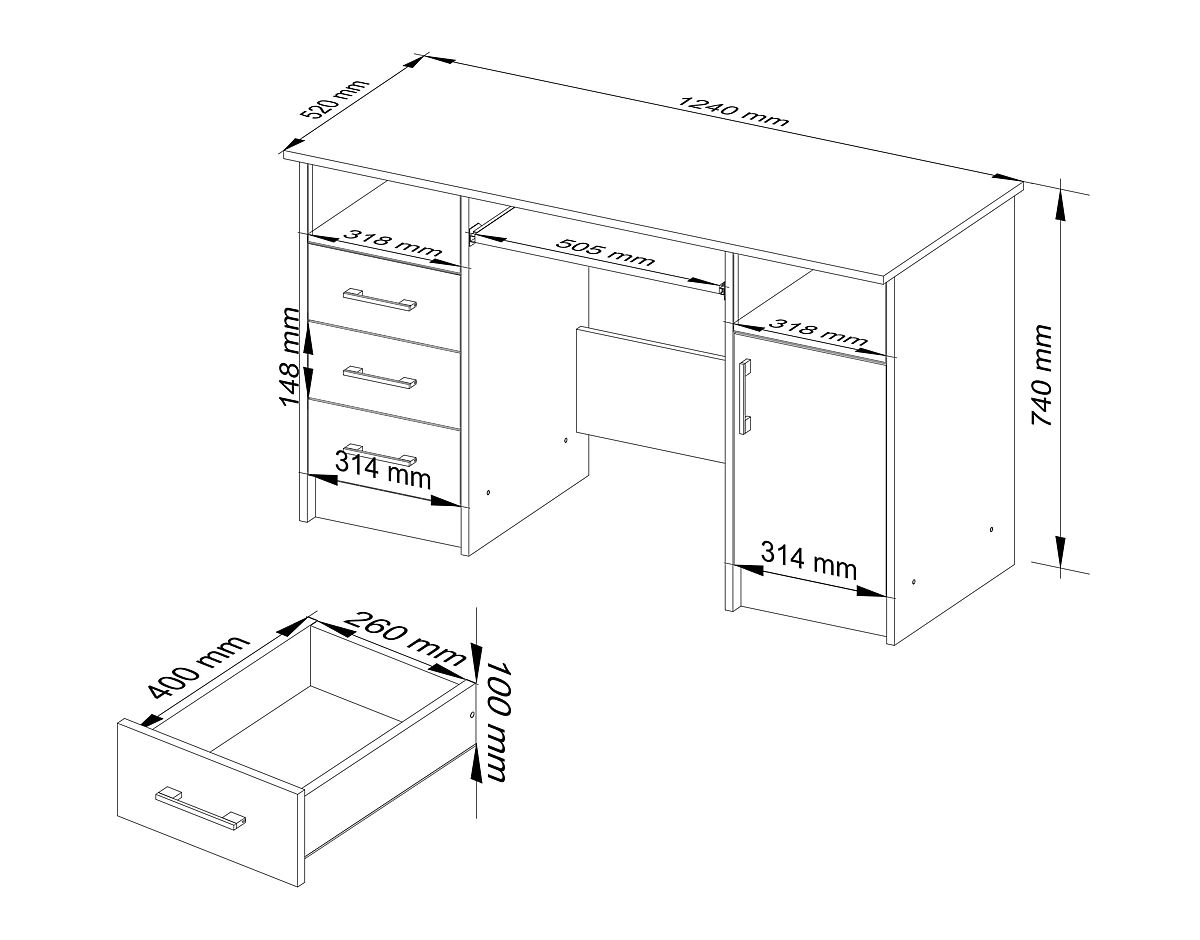 Realizzato in pannello laminato resistente all'abrasione. Il piano, i lati e i frontali sono bordati con bordo ABS. Dispone di un ripiano estraibile per la tastiera, 3 cassetti e un'anta con frontali in pannello laminato.