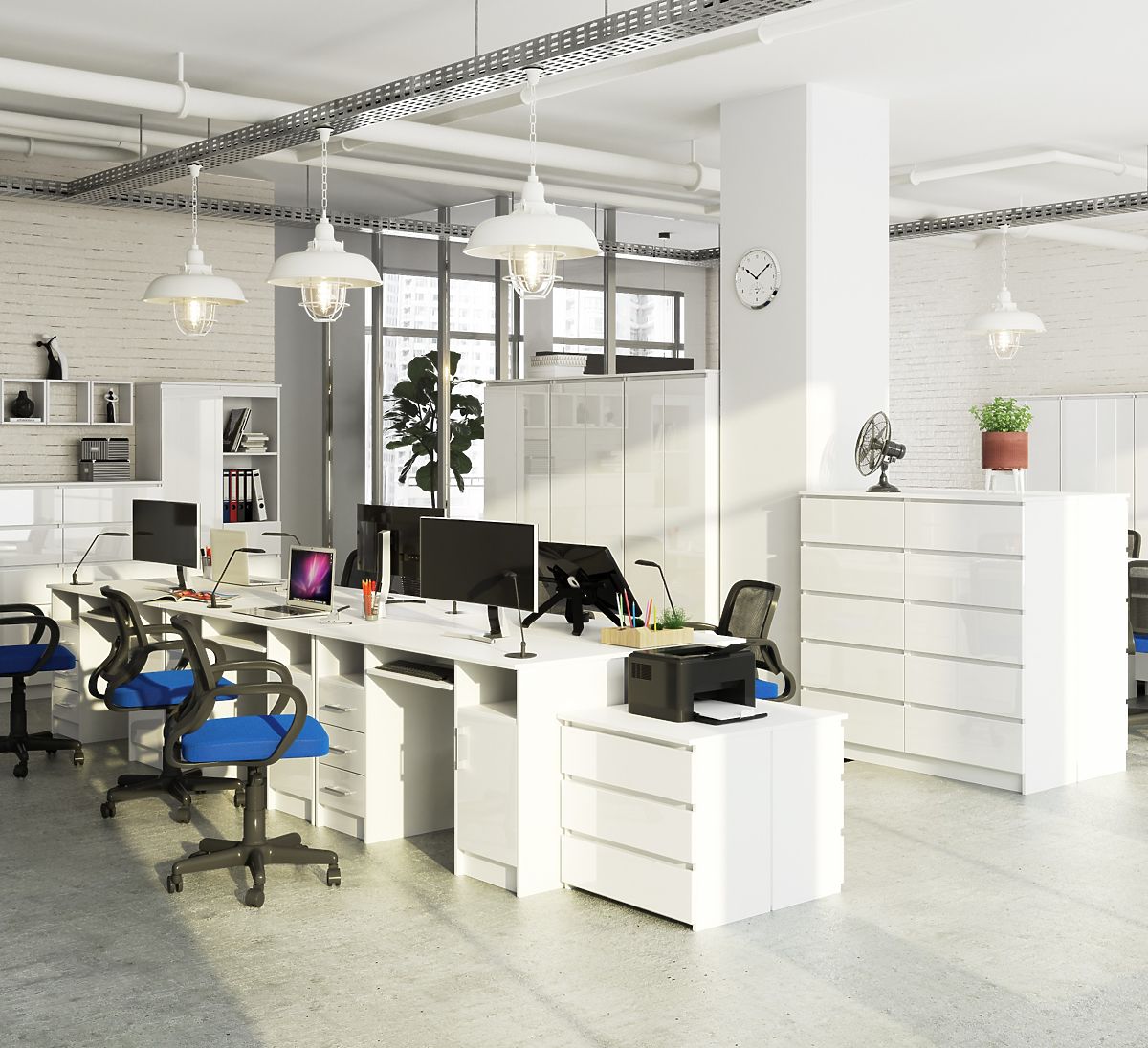 Scrivania bianca con tre cassetti e ripiani per organizzare il lavoro. .. altro