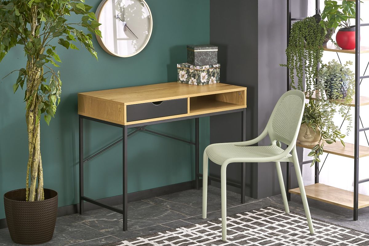 La scrivania B-50 è la scelta ideale per scolari, studenti e angoli di lavoro domestici. Grazie al suo design semplice ma moderno in decorazione rovere dorato abbinato a gambe in metallo nero, si integra facilmente in qualsiasi ambiente, dalla stanza degli studenti all'ufficio domestico. La scrivania offre una soluzione di archiviazione pratica con un cassetto e uno scaffale aperto dove è possibile riporre quaderni, libri, forniture per ufficio o piccoli dispositivi elettronici. La superficie di lavoro è abbastanza grande per un laptop, una lampada e altre necessità. Il laminato utilizzato per la produzione della scrivania è resistente ai graffi, alle ammaccature e alle macchie, garantendo una lunga durata e una facile manutenzione.