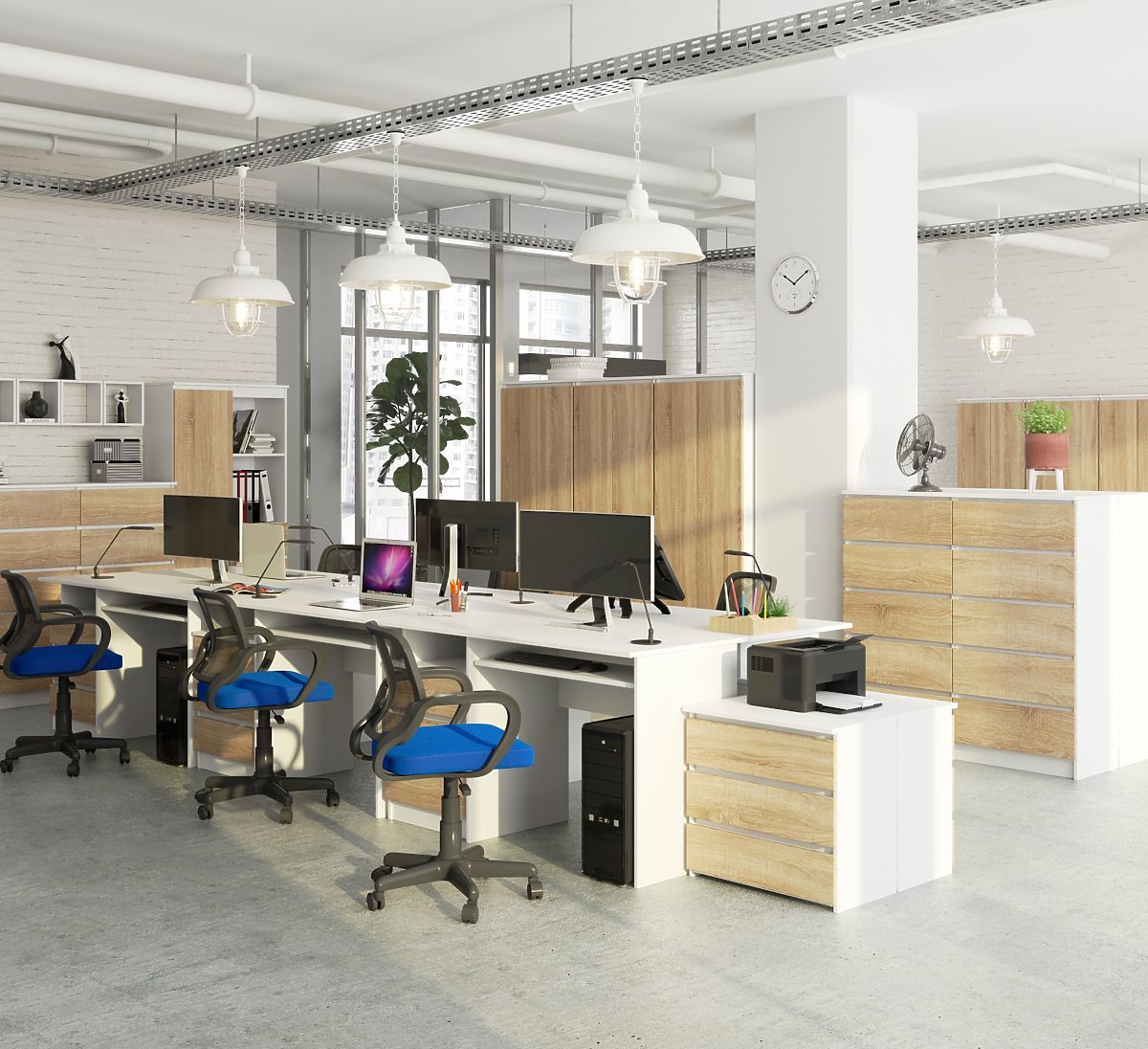 Scrivania in pannello laminato resistente con corpo bianco e frontali sonoma. .. altro