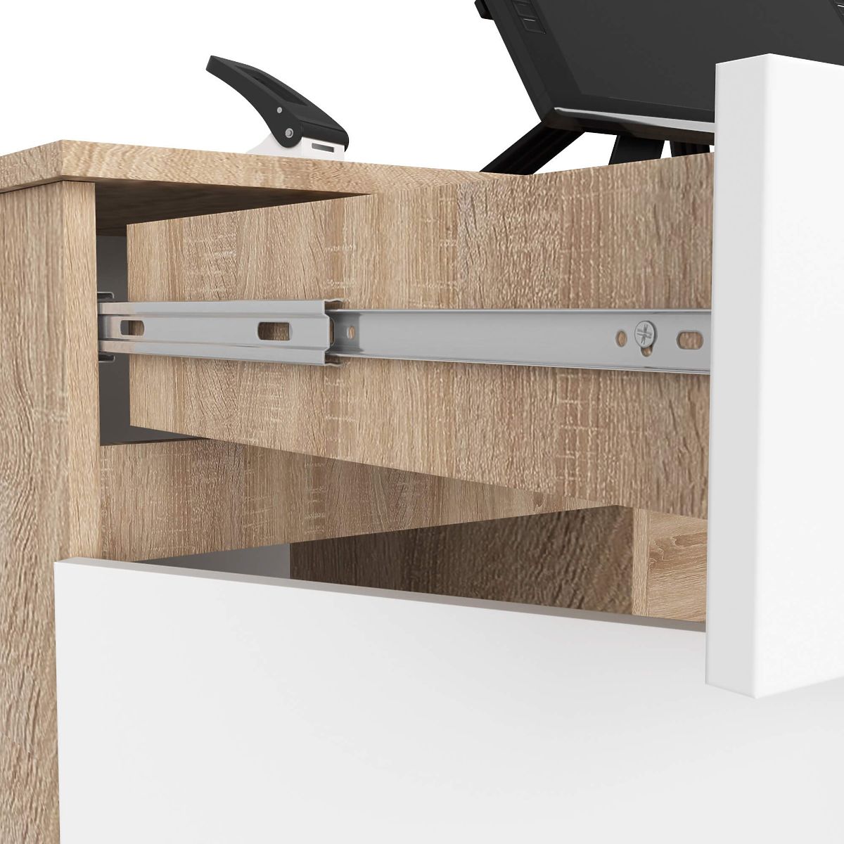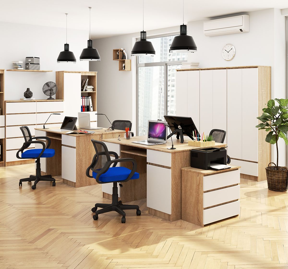 La scrivania A5, lunga 135 centimetri, che combina due colori alla moda (rovere sonoma e bianco), è destinata sia a chi arreda un ufficio, sia a uno studio domestico, una camera per bambini o studenti.