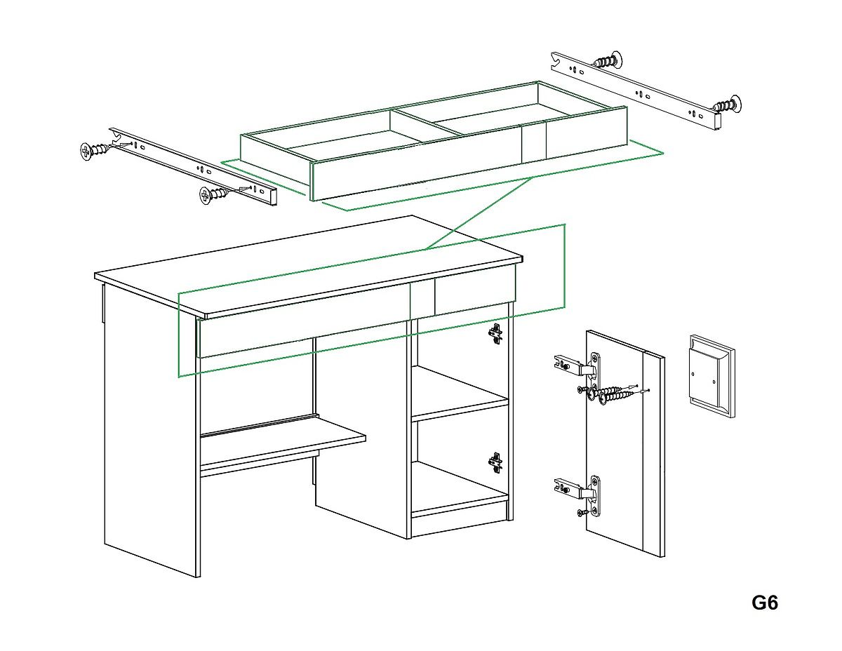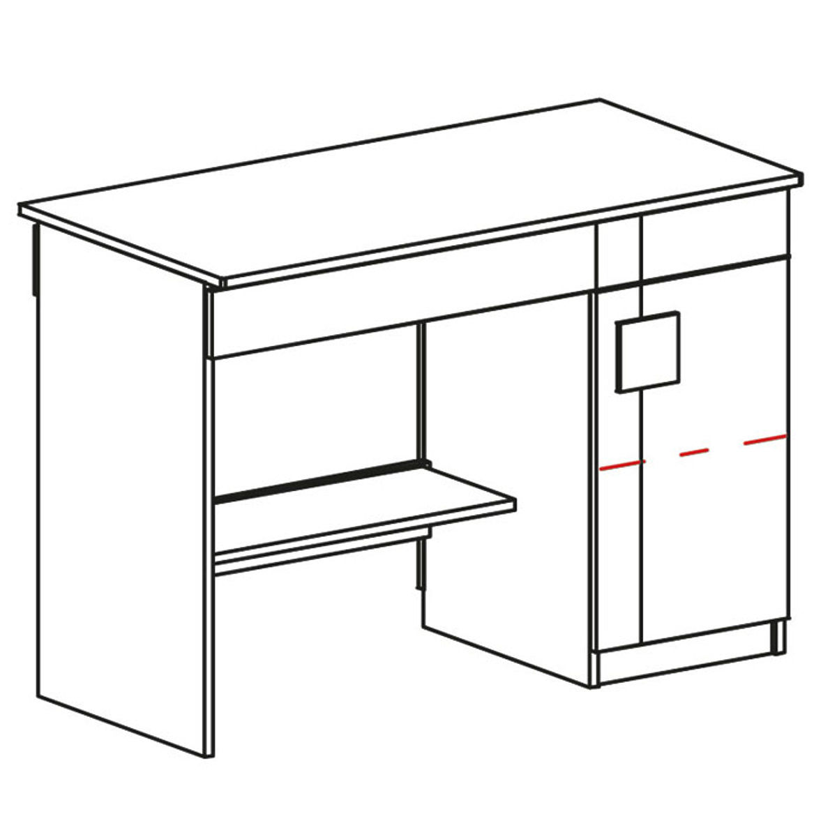 Un ulteriore spazio di archiviazione è dietro l'anta con maniglia. All'interno dell'armadietto c'è un ripiano. Nella parte inferiore della scrivania c'è una mensola aperta che i bambini possono riempire a loro piacimento.