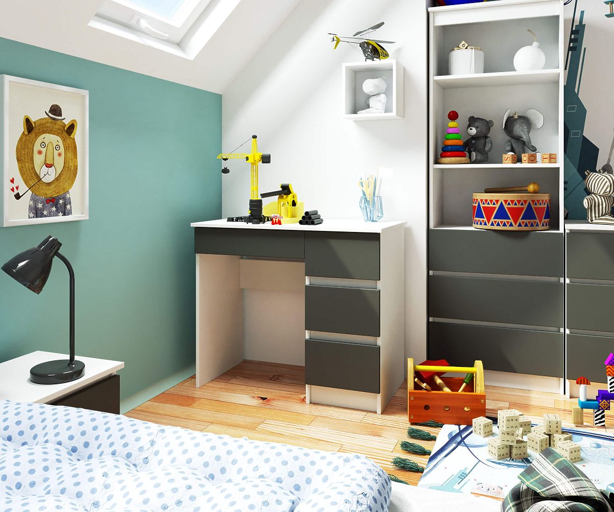 La scrivania per computer A-7 è un piccolo mobile che trova impiego in spazi ridotti, sia in ufficio che in casa. È adatta, ad esempio, per un ufficio domestico o una camera per bambini/adolescenti. Il prodotto presentato combina due colori contrastanti ma perfettamente complementari: grafite grigio e bianco. È composta da tre cassetti destinati a un'organizzazione personalizzata. Un mobile semplice nella sua forma, ma straordinariamente funzionale, sarà sicuramente apprezzato da chi desidera creare un angolo di lavoro o studio, ma non dispone di molto spazio.