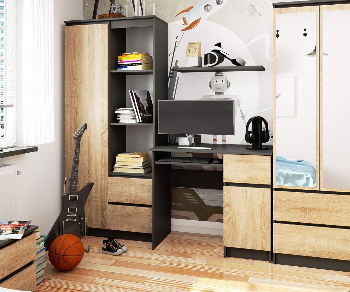 La scrivania indipendente PIKSEL 90 cm nei colori GRAFITE GRIGIO/ROVERE SONOMA è la soluzione ideale per piccoli interni. Funziona molto bene come scrivania scolastica o per computer. La sua costruzione ergonomica garantisce comfort durante l'uso. La scrivania è dotata di un ripiano estraibile per la tastiera, un pratico cassetto laterale e un armadietto con ripiano, dove possono essere posizionati liberamente raccoglitori e libri. Per la realizzazione della scrivania è stato utilizzato un piano opaco piacevole al tatto e facile da mantenere, rivestito con uno strato resistente di laminato. Il tutto è completato da pratiche maniglie color argento.