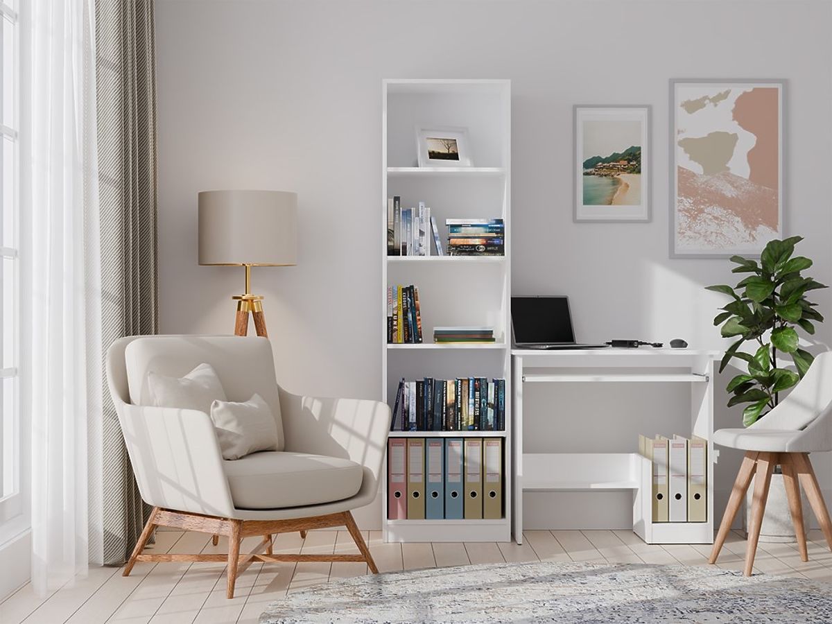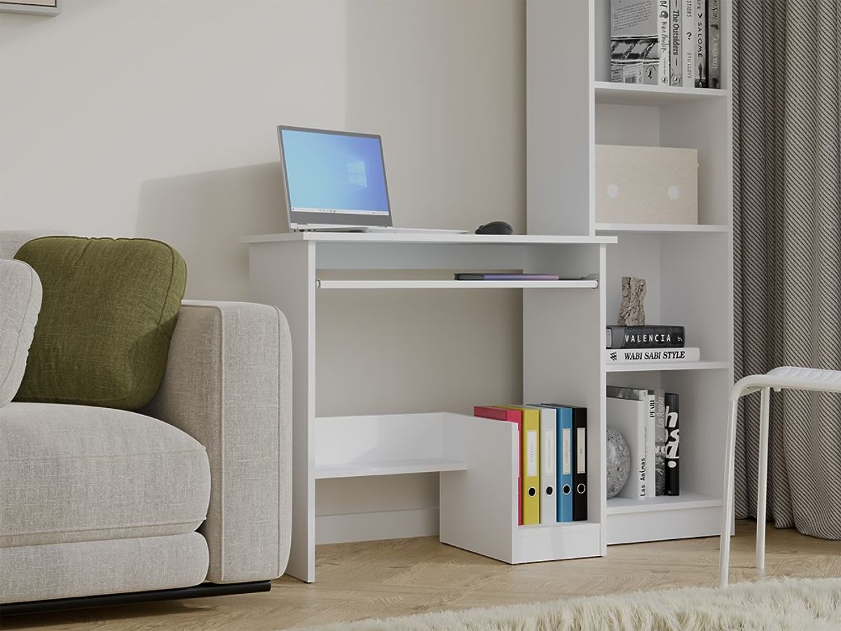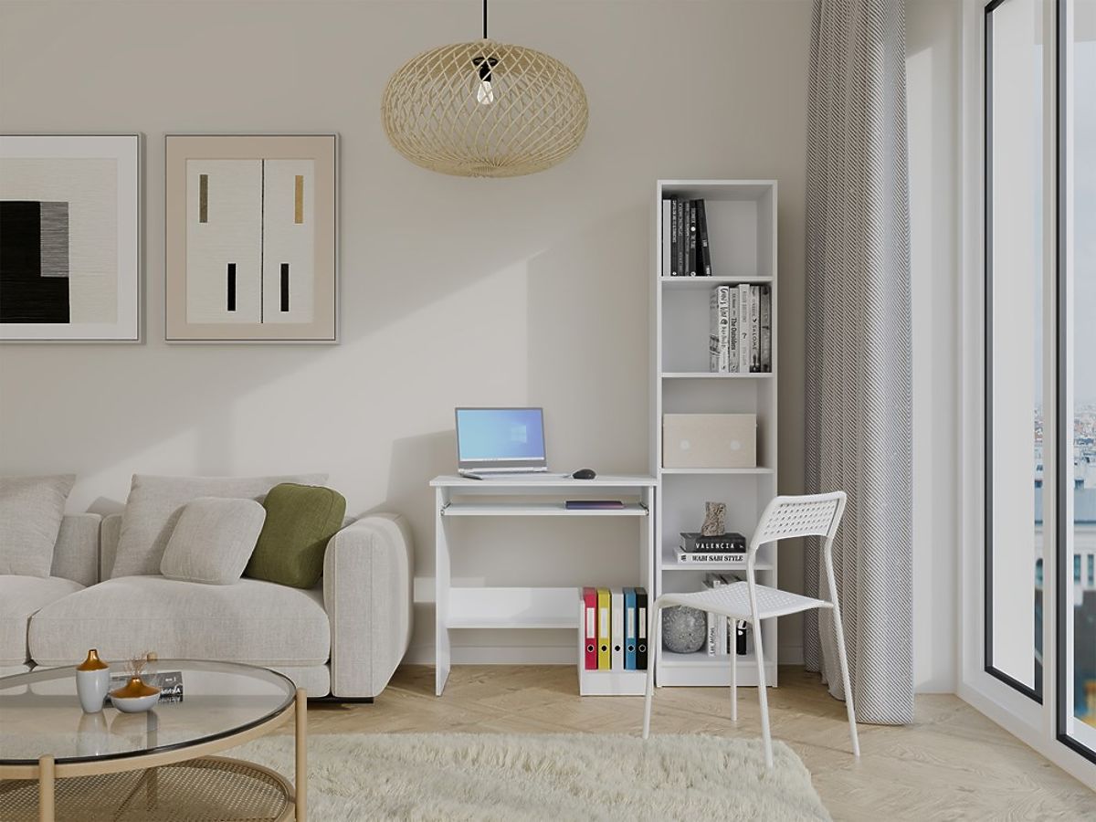 Il mobile è dotato di soluzioni pratiche che aumentano il comfort di lavoro: comodo ripiano estraibile per la tastiera, spazio per l'unità centrale del computer o raccoglitori e un ulteriore ripiano inferiore per lo stoccaggio.