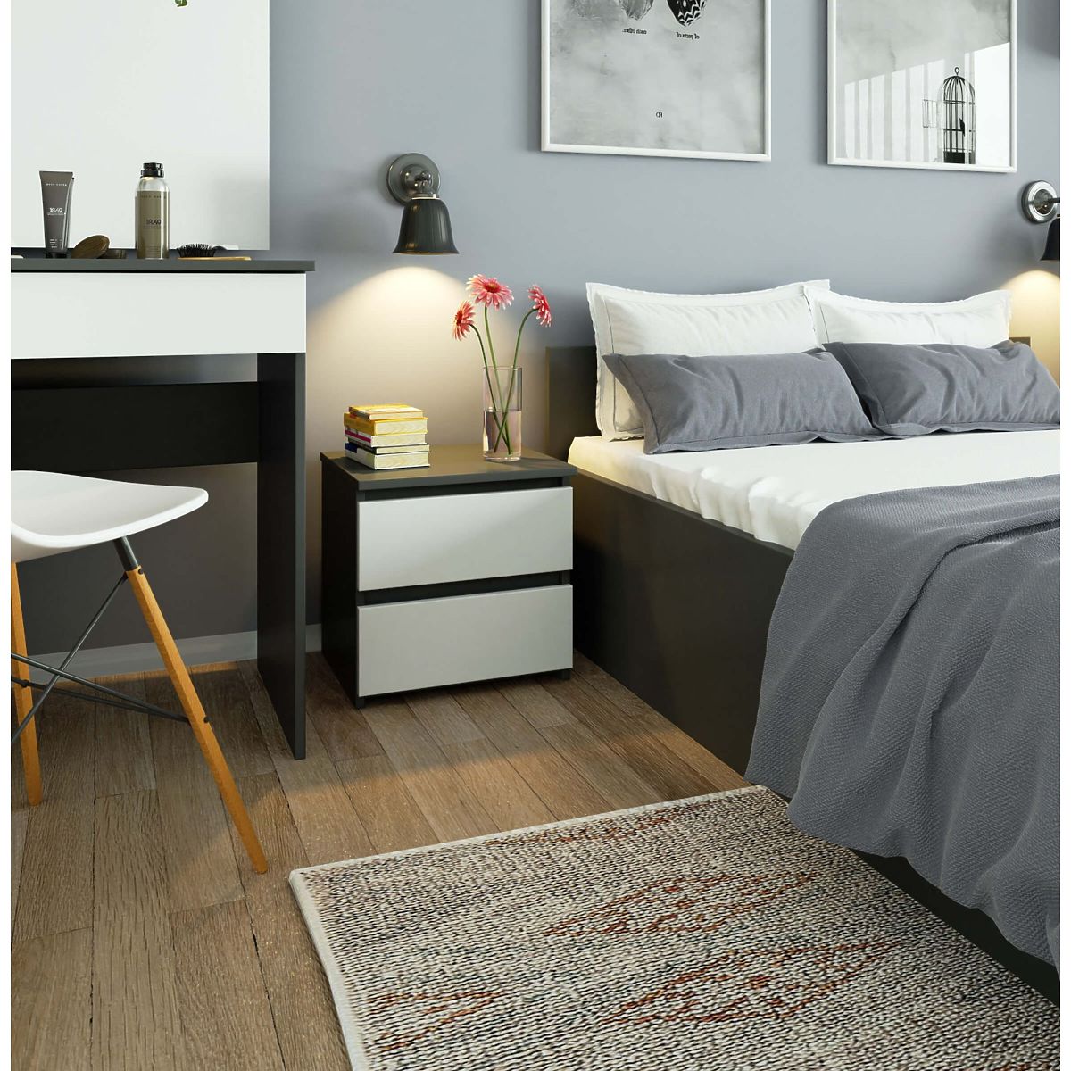 I comodini sono un tipo di arredamento popolare che si posiziona accanto al letto. Sulla sua superficie è possibile posizionare una lampada, mentre nei cassetti - oggetti importanti che migliorano la qualità del riposo e del sonno. Nella nostra offerta è disponibile il comodino CL2 40 cm nel colore grafite grigio con frontali bianchi. Appare elegante e moderno, ed è allo stesso tempo funzionale. Si adatta perfettamente a qualsiasi camera da letto e alla stanza dei giovani.