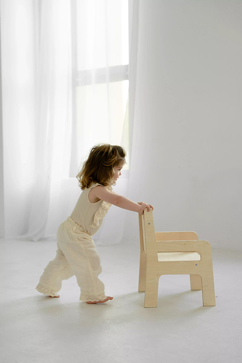 Sedia in legno per bambini è progettata per bambini di diverse età – adatta sia a un bambino di un anno che esplora il mondo, sia a un bambino più grande e creativo in età prescolare. Fornisce un solido supporto per la schiena e allo stesso tempo garantisce una seduta confortevole durante il gioco, il disegno o i pasti. È ideale anche in cucina o in bagno – il bambino può salire sul sedile e raggiungere facilmente il piano di lavoro o il lavandino. Tutti i bordi sono accuratamente arrotondati per garantire la massima sicurezza ai piccoli utenti.