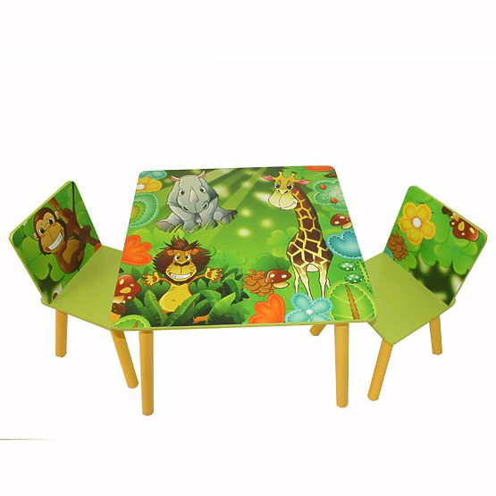 Un bellissimo tavolino con due sedie con motivi di animali della giungla illuminerà ogni stanza dei bambini.