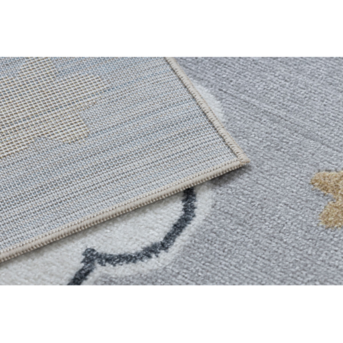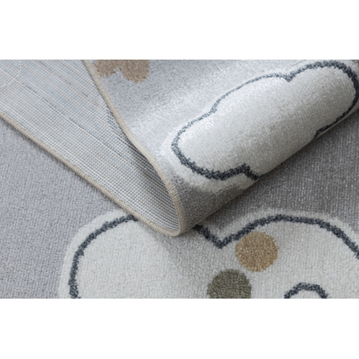 Il tappeto rettangolare BONO 8437 Nuvole e cielo porta dolcezza, tranquillità e armonia nella cameretta dei bambini. Il fondo grigio chiaro combinato con dettagli crema crea un aspetto rilassante ed elegante, che si adatta facilmente a interni moderni e classici.